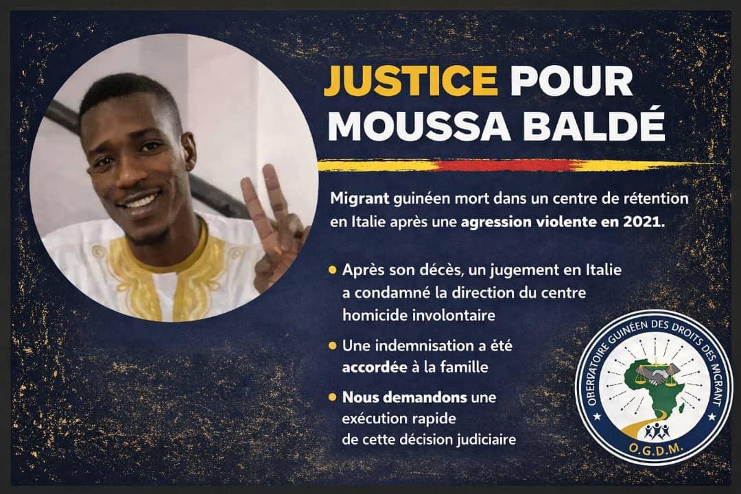 CONAKRY – Le combat pour la dignité des migrants franchit une étape décisive. Près de cinq ans après le décès tragique de notre compatriote Moussa Baldé en Italie, la justice a enfin tranché. Le 11 février 2026, le tribunal de Turin a reconnu la direction du Centre de Permanence pour le Rapatriement (CPR) coupable d’homicide involontaire.